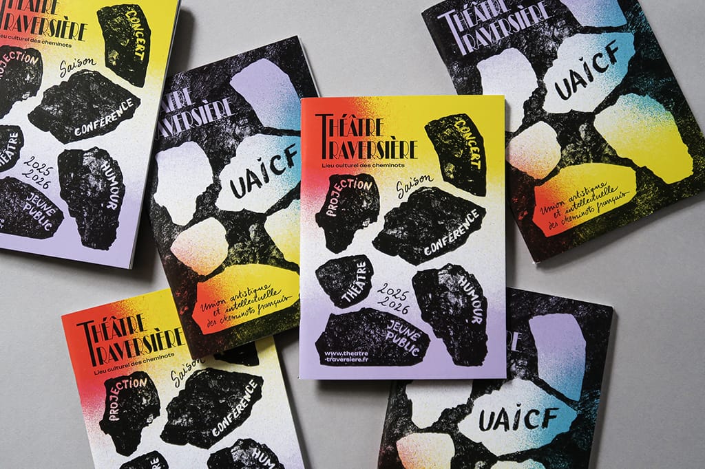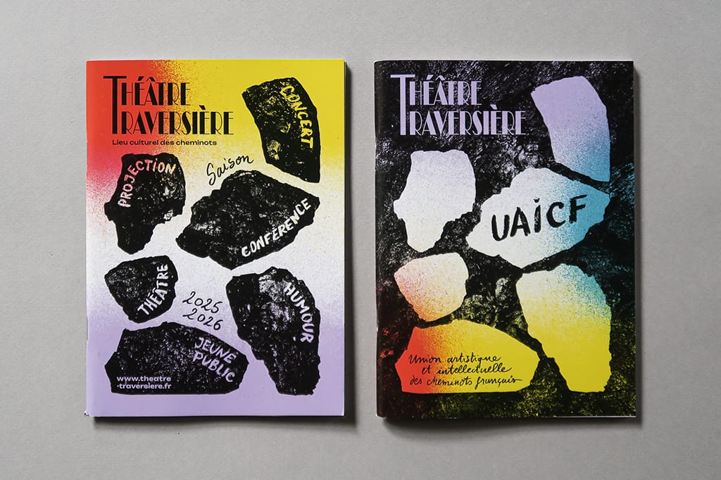 Créé en 1927 par et pour les cheminots, le Théâtre Traversière propose une saison aux influences rock, punk et rap. Le défi du visuel était donc de traduire ces notes underground tout en rendant hommage à l’histoire du lieu. L’inspiration vient des abords des gares : ces zones de stockage, un peu brutes, où cohabitent tags et structures industrielles. J’ai voulu évoquer cette ambiance en représentant des morceaux de charbon. Un clin d’œil au passé ferroviaire et à l’époque des locomotives à vapeur.